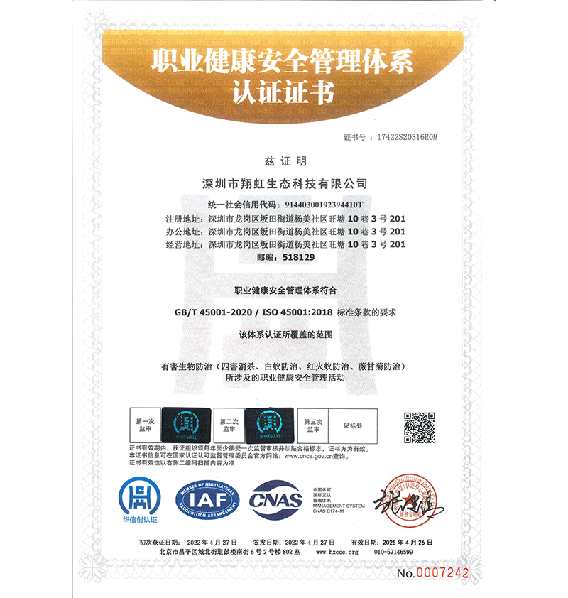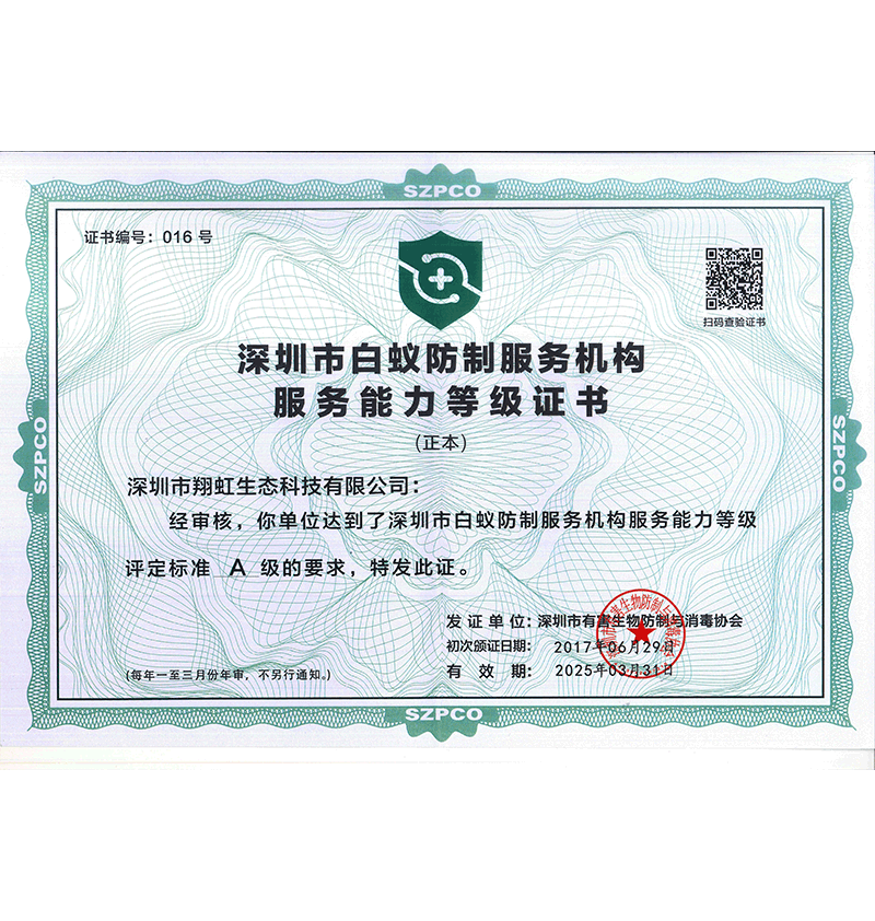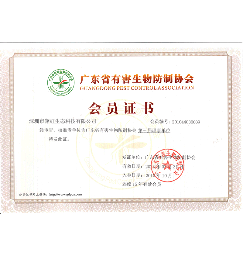 深圳市翔虹生態(tài)科技有限公司成立于1995年,是深圳最早成立的專業(yè)蟲害防治公司之一。公司發(fā)展至今獲得全國有害生物防制服務(wù)A級資質(zhì)、廣東省有害生物防制服務(wù)A級資質(zhì)、深圳市有害生物防制服務(wù)A級資質(zhì)、廣東省有害生物防制服務(wù)A級資質(zhì)、深圳市有害生物防制服務(wù)甲級資質(zhì)的單位,是中國有害生物防治協(xié)會會員、廣東省有害生物防治協(xié)會會員、深圳市有害生物防治協(xié)會理事單位,多次獲得“深圳市十佳消殺單位”榮譽。